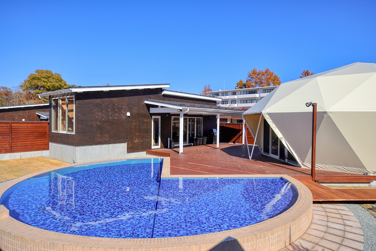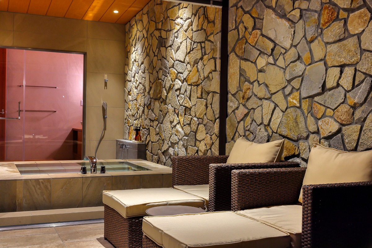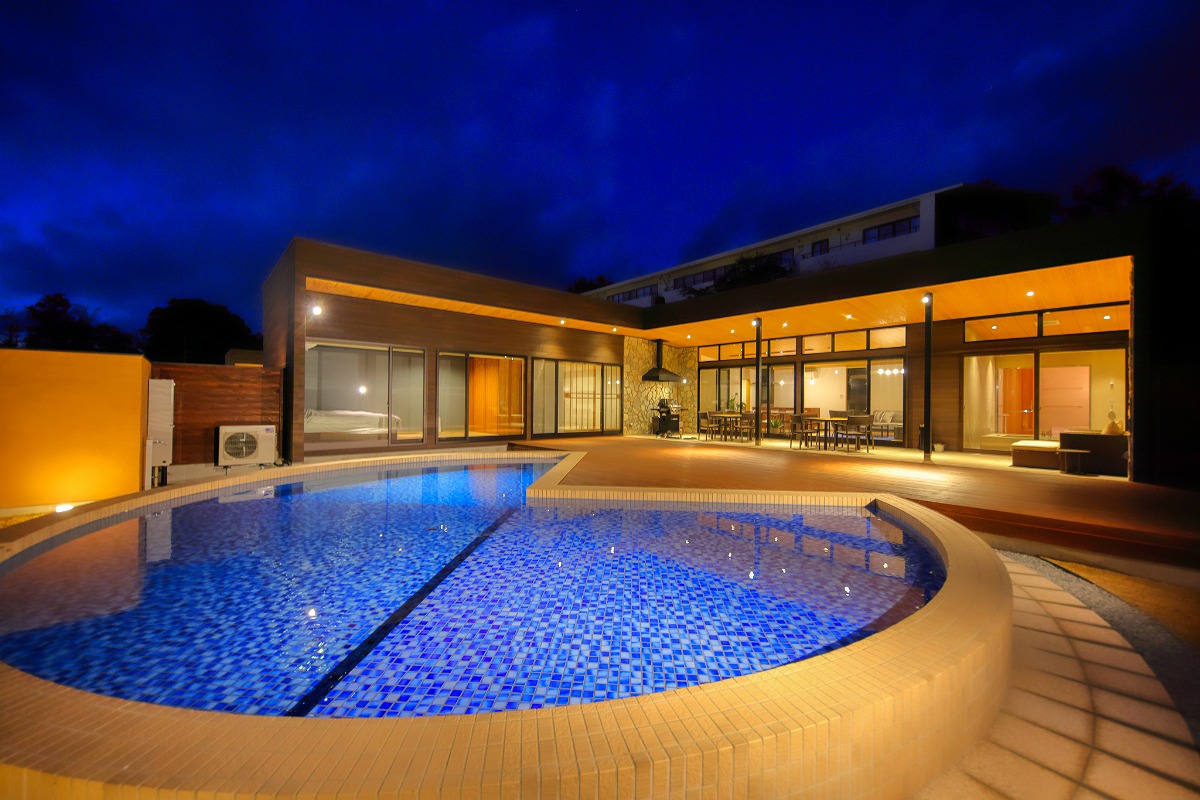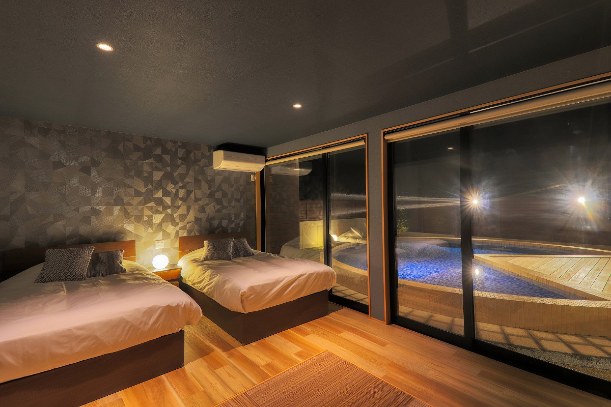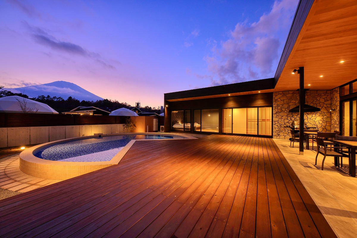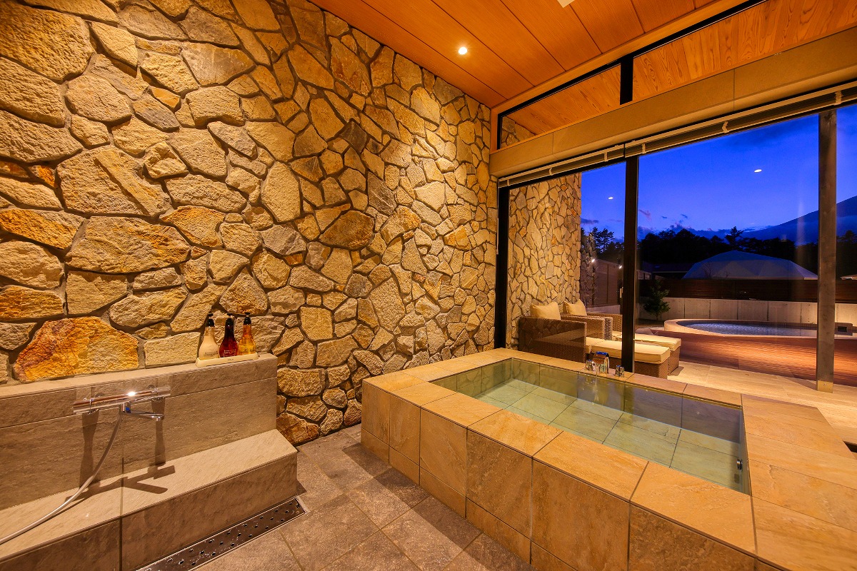 This luxury villa features individual amenities such as a natural hot spring bath, private pool, barrel sauna, private garden, and fire pit.