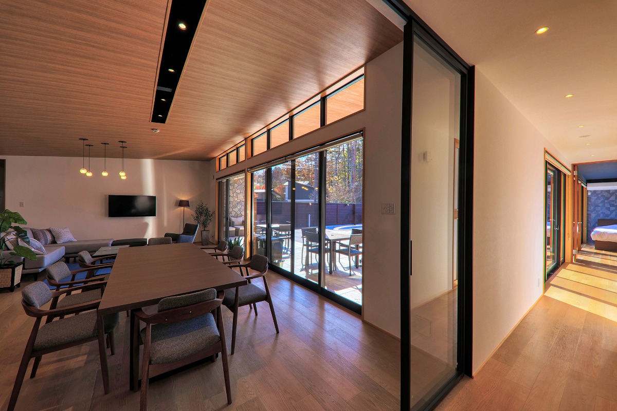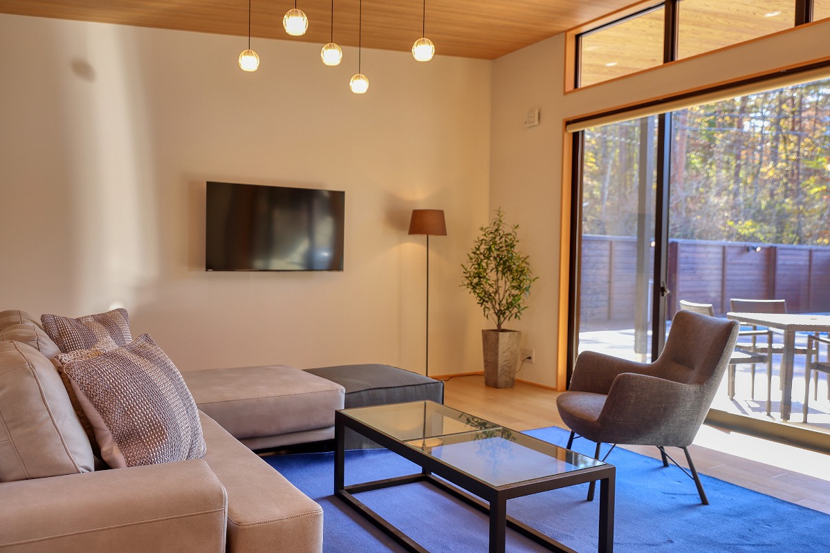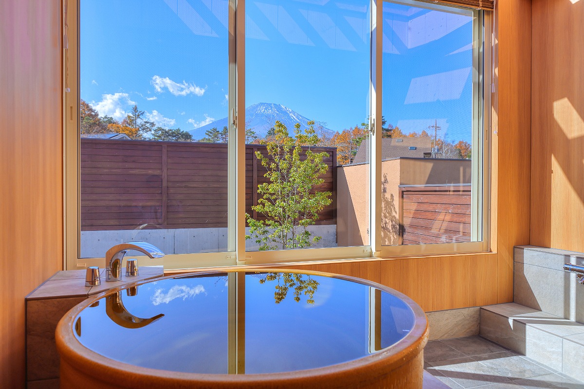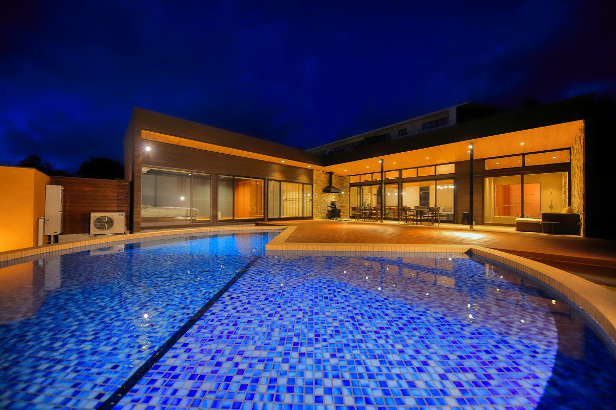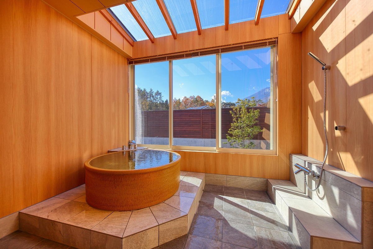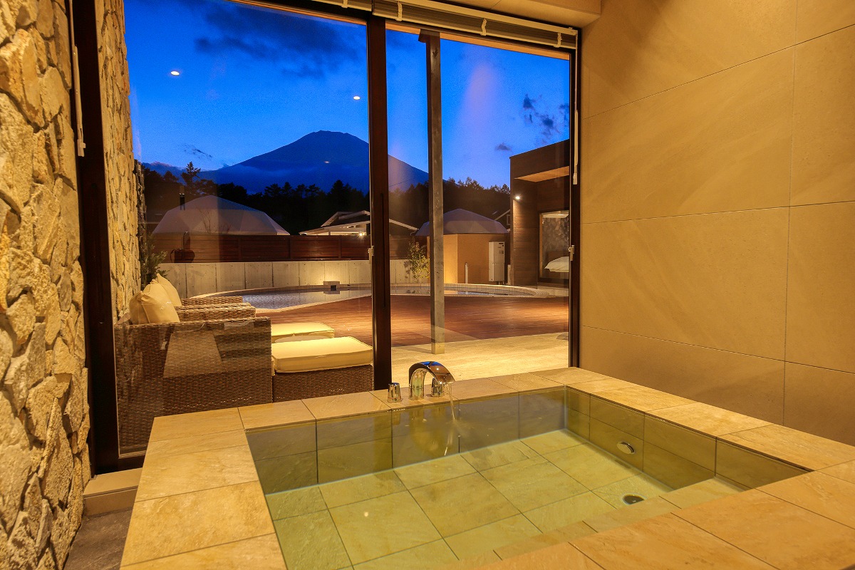 This luxury villa features individual amenities such as a natural hot spring bath, private pool, barrel sauna, private garden, and fire pit.