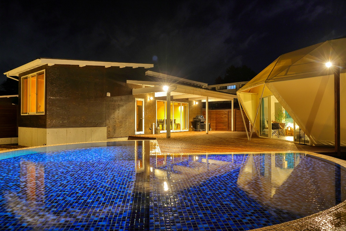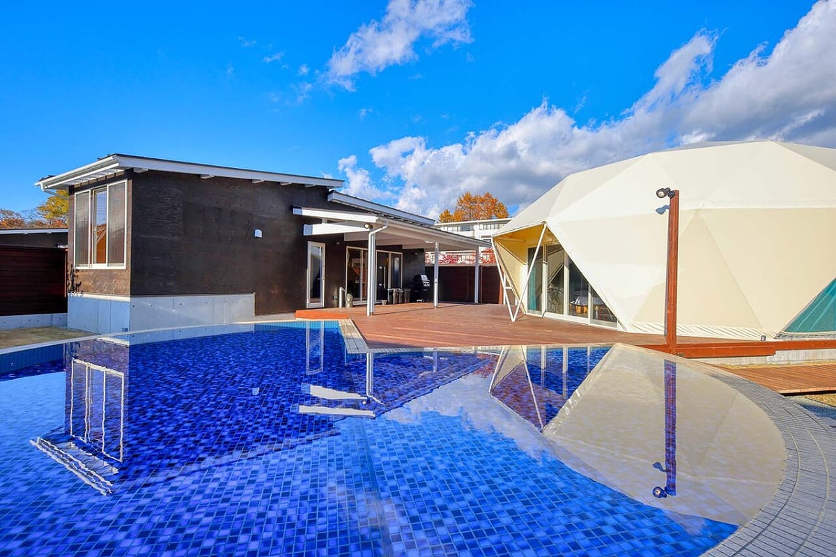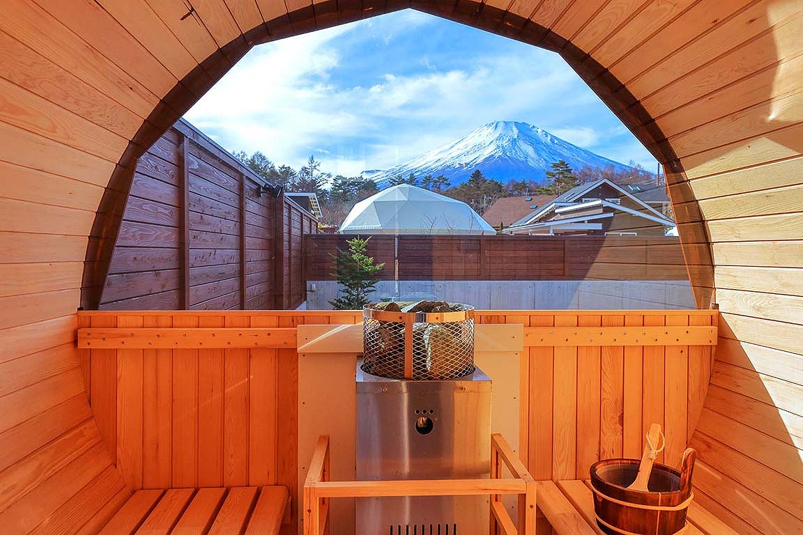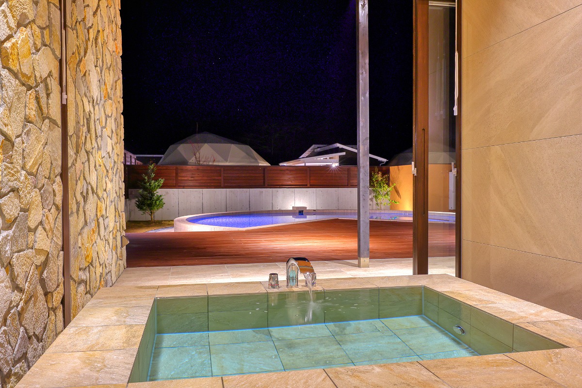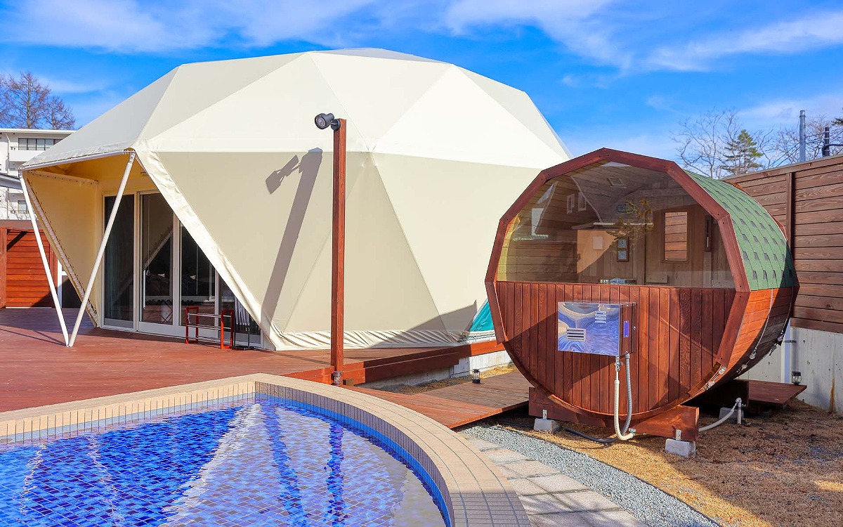 This luxury glamping experience includes individual amenities such as a natural hot spring bath, private pool, barrel sauna, private garden, and fire pit.