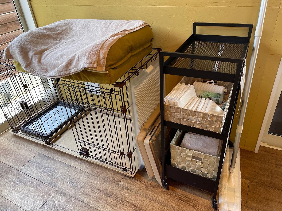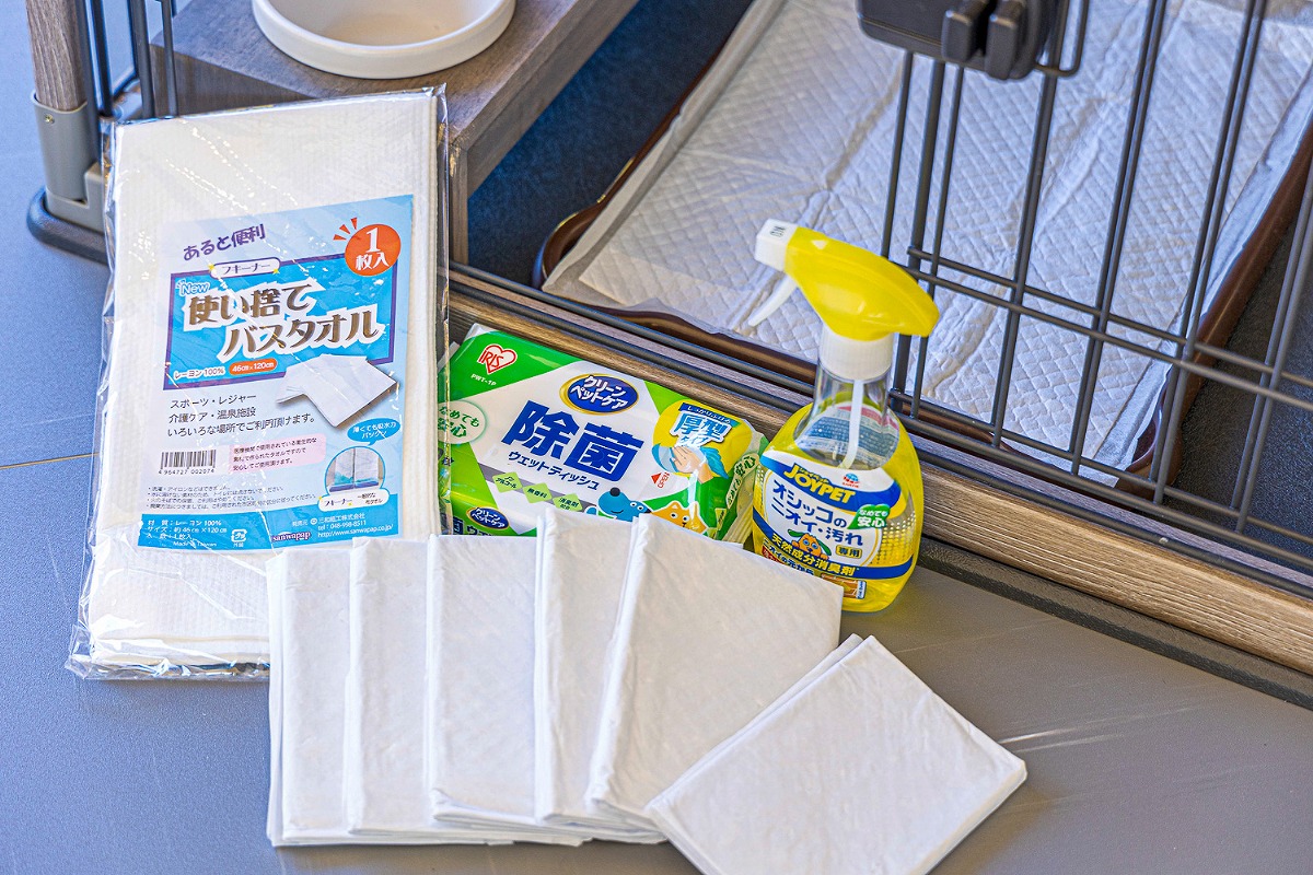 Toilet tray, toilet sheets, crate, food and water bowls, bath towels, face towels, wet wipes, deodorizing mist, poop bags |